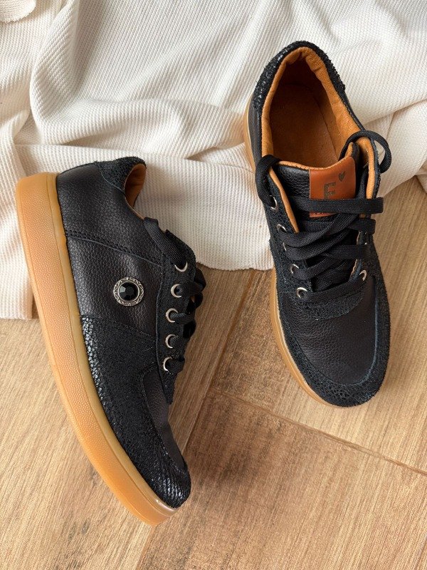 Zapatillas confeccionadas íntegramente en cuero vacuno en combinación de negros. Horma normal. Detalle de aplique. Suela liviana.