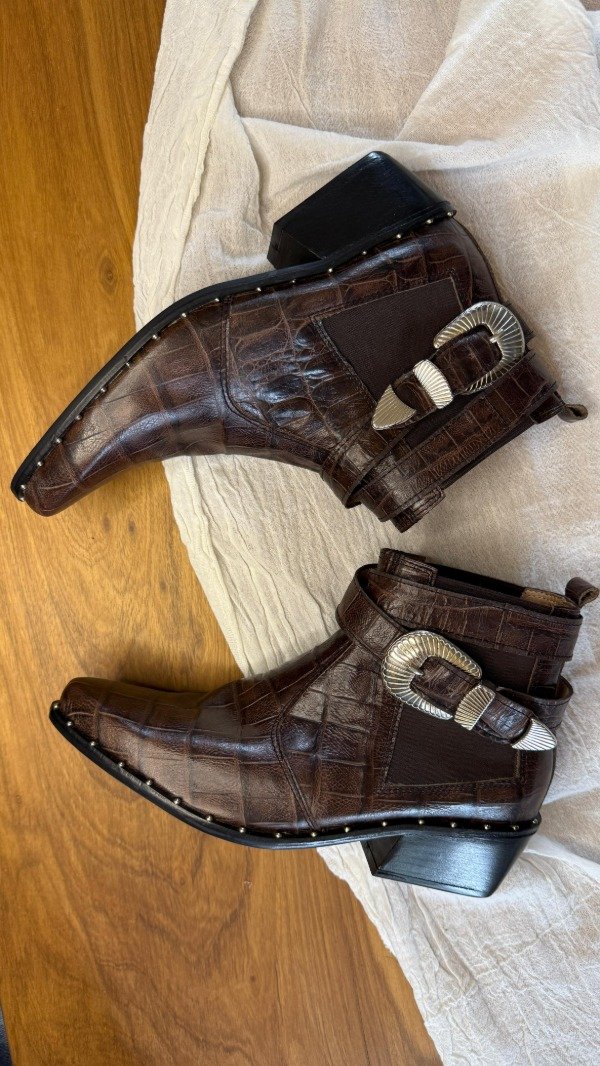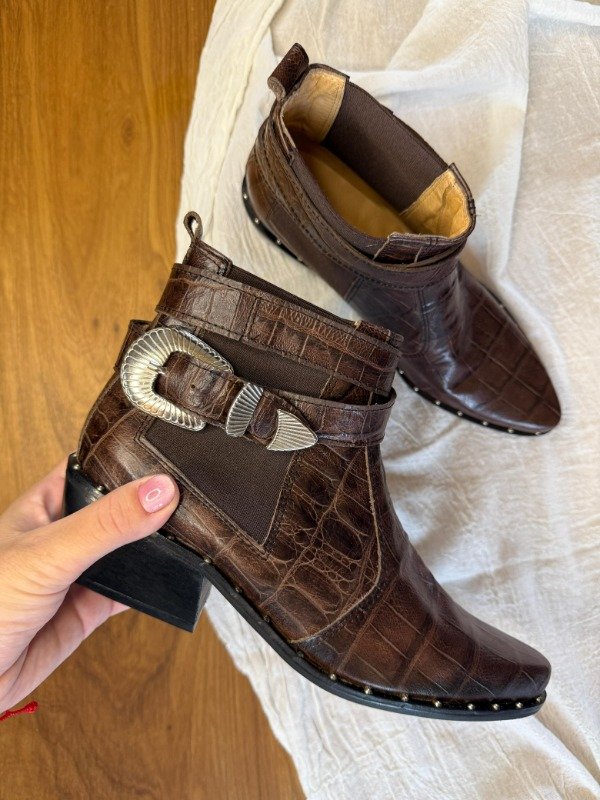 Botineta de cuero vacuno con líneas limpias, elástico lateral y cinto desmontable como sello distintivo.